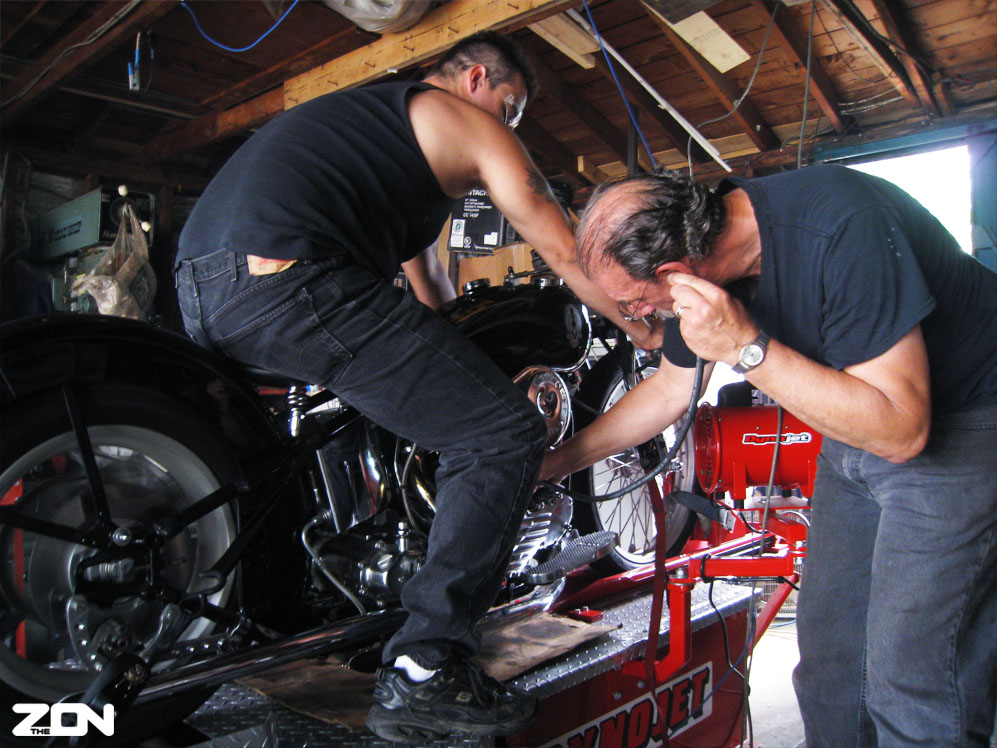 Lurch and his son Tommy have jumped into this final push full-on and it's starting to pay off. Yesterday we started it up for the first time since the head gasket failures and the upper end is oil tight and strong (thanks to Lurch's skills with a Bridgeport)! Last night about 2 minutes before we turned on the dyno we heard a loud CRACK and like that Detroit went dark. The city had experienced a major power outage due to a storm that rolled through the city so we never got a chance to light the wick. Instead we sat in the dark with a calculator and dialed in all my gear ratio's for the salt. We figured out what final drive sprocket will be used for my record attempt and which ones to use if the bike isn't working the way we designed it to. With Wendover's altitude plugged into the dyno and the power back on hopefully dyno runs can take place this evening.